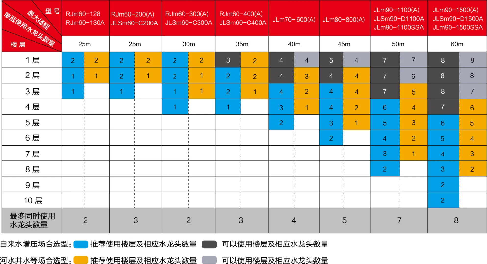 2、當(dāng)進(jìn)水管路沒有壓力時(shí)(用于河水、井水場(chǎng)合的選型方法):針對(duì)目標(biāo)房間選型,每個(gè)水龍頭流量的0.8m3/h,因電泵吸程高度不超過8m,電泵安裝位置至水平面的垂直高度在 6m 內(nèi)最佳,按電泵最大揚(yáng)程的70%選型,選型時(shí)需考慮電泵的安裝高度及進(jìn)出水管路的損耗(按5m計(jì)算)